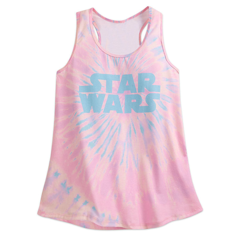 This new women’s Star Wars tie-dye tank top is now available at the Disney Store. The tank top has an all-over tie-dye effect, in pink and blue tones, and a blue Star Wars logo on the front. The tank top has a flared silhouette and a scoop neckline. I love the pretty pastel colours, perfect for spring.