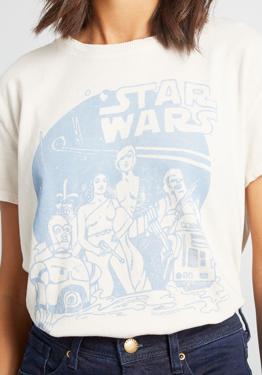 Before sitting down with your fave flick, whip up some popcorn, dim the lights, and don this Star Wars graphic tee! Vintage-inspired with light distressing, a relaxed fit, and a pale blue screen print of the original cast, this piece puts you in the mood to travel to a galaxy far, far away – even if it is from the comfort of your abode