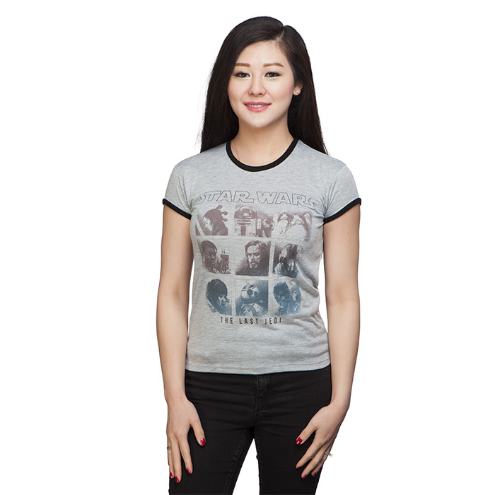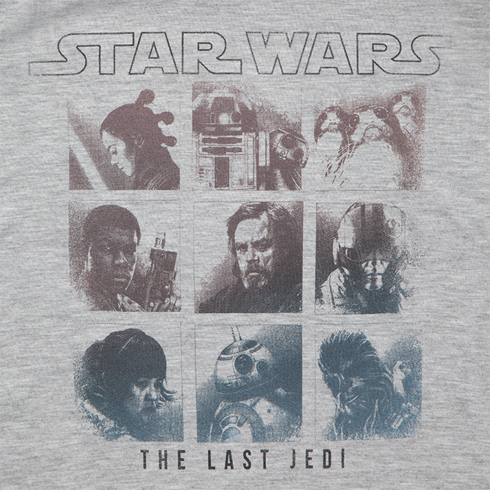 If you had a hard time deciding who your favorite good guy was in Star Wars: The Last Jedi, we have your shirt. This heather grey ringer features a grid of 9 images including, Rey, R2 (and BB-8), some Porg, Finn, Luke Skywalker, Poe, Rose, BB-8 (again), and Chewie (with another Porg for a total of FOUR Porg).
