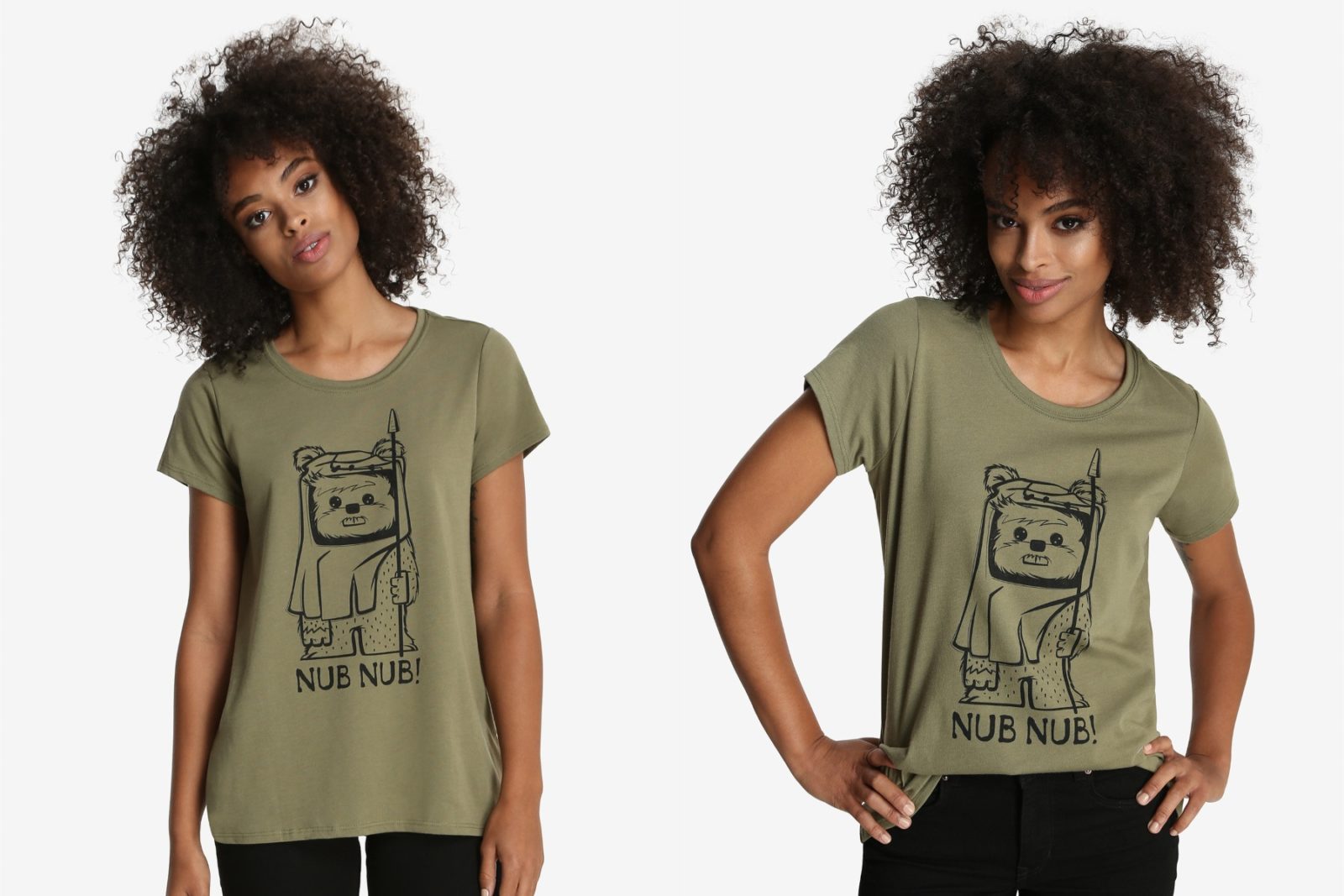 This cute women’s Her Universe Star Wars Ewok t-shirt is now available at Box Lunch. The olive green t-shirt features a drawing-style print of an ewok, with the text ‘Nub Nub’ underneath.