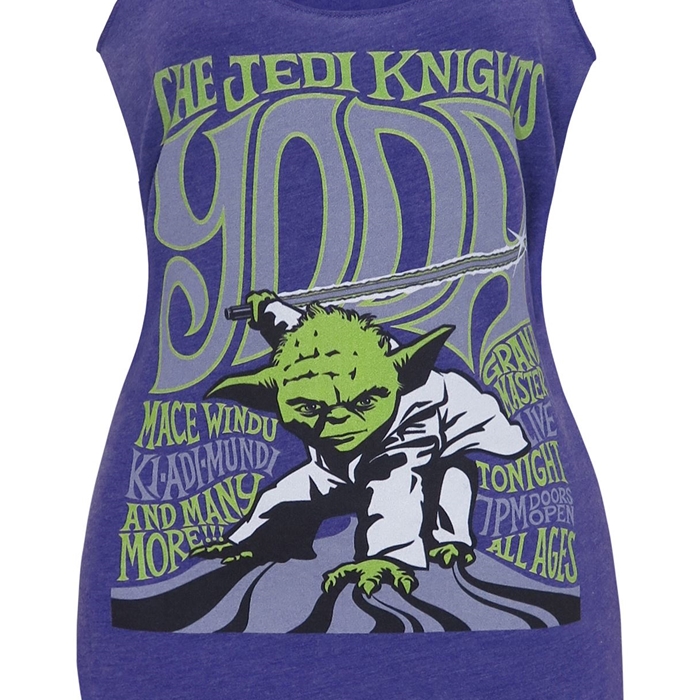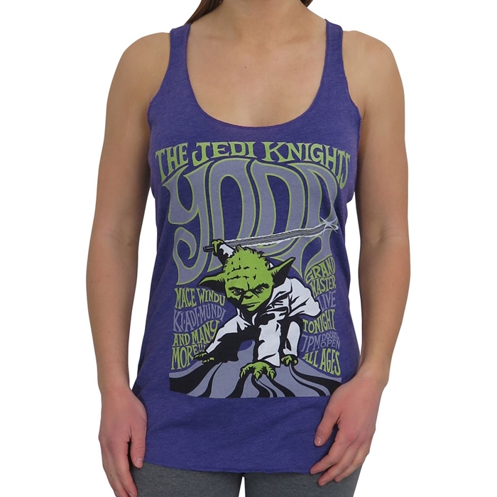 This women’s Star Wars Yoda & The Jedi Knights tank top is now available at SuperHeroStuff. The heather-purple racerback style tank top features a prequel themed front print of Yoda. The design is inspired by a rock concert poster, advertising ‘Yoda & The Jedi Knights’ – such a fun design!